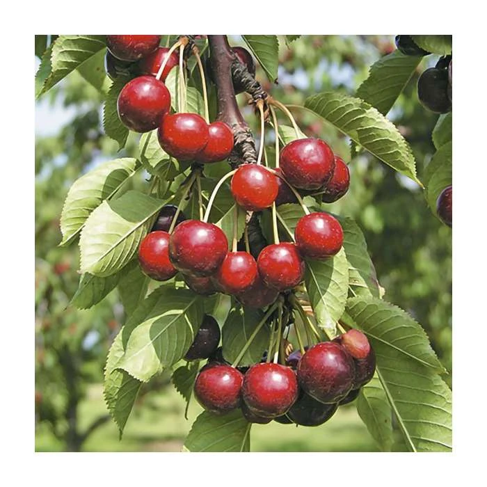 The multitasking ‘Hartland’ has a profusion of white blossom in spring which readily sets fruit, and a crop of intense deep reddish-purple, shiny cherries from mid-June to mid-July. The normal-sized cherries are roundish oblong and moderately sweet and firm and are best eaten fresh.